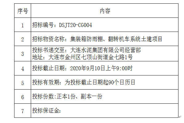 2.项目说明:金年会(中国)官方网站组织对大连水泥厂2#钢仓北侧新建两条水泥集装箱系统防雨棚、2#钢仓北侧水泥集装箱翻转机装车系统土建、3#、4#库侧水泥集装箱防雨棚项目项目进行邀请招标。凡接到本招标邀请的厂商均可参加投标。