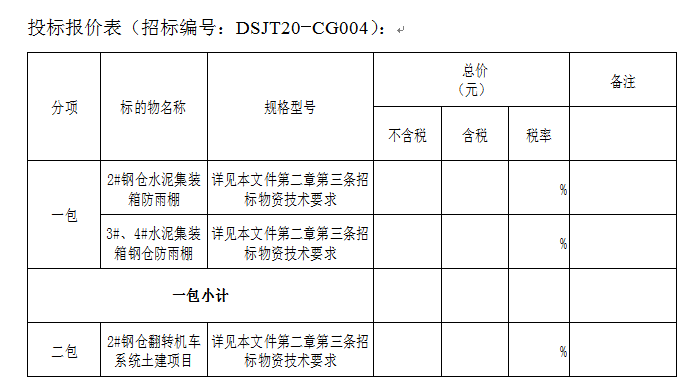 1.根据已收到贵方招标编号为DSJT2020-CG004的金年会(中国)官方网站水泥集装箱防雨棚(或翻转机车系统土建项目)招标文件,遵照《中华人民共和国招标投标法》等有关规定,我单位经考察和研究上述招标文件的投标须知、约定条款、技术规范及其他有关文件后,我方愿投标报价(详见报价一览表)。